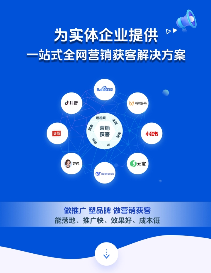 以帮助客户拓展更多“获得客户和经营客户”为主线,以 SaaS 云平台为主要服务模式的运营理念,打造企业服务云端生态体系,为实体企业获取ToB及大客ToC,提供多平台低成本推广获客解决方案;为实体品牌/门店数字化运营,提供私域经营模式设计+私域系统开发+运营陪跑……等一站式实体企业数字化营销解决方案。